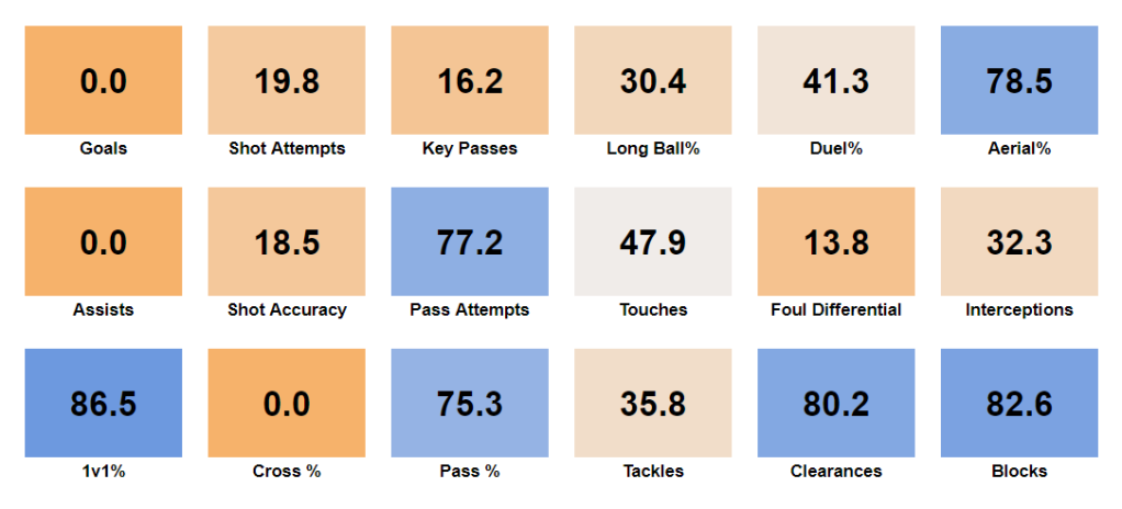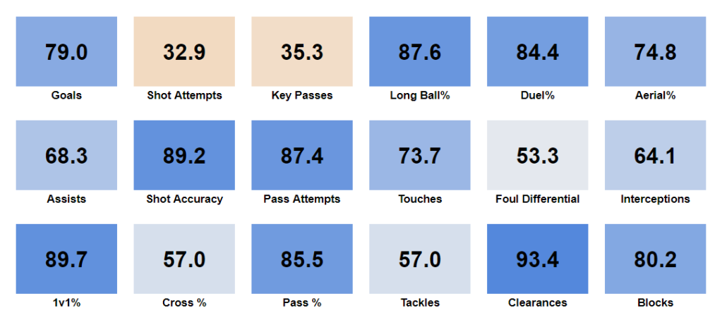 His defensive numbers are his strongest attribute, registering at 78.3%. He's great at blocking shots and clearing the ball, tidying up his own 18-yard box nicely. He's also above average in the air (remember how I mentioned the coaching staff wanted him to get involved on set pieces?). However, his foul differential is quite low and is indicative of having to take fouls to stop opponents versus beating them cleanly.