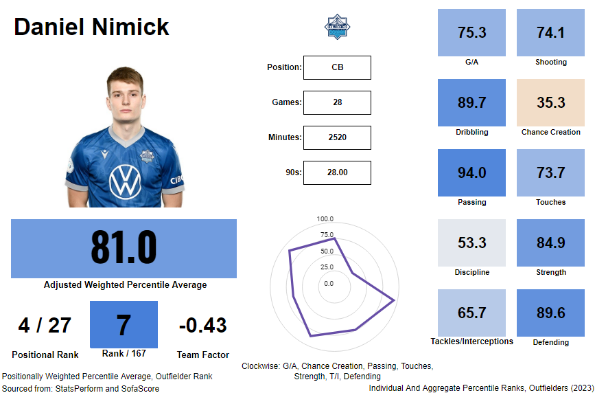 Nimick is also defensively excellent. He mostly wins his duels (84.4%) and is above average in the air (74.8%). Sifting through his sub-categories, he's elite at clearances (93.4%) and great at blocking shots in a pinch (80.2%). There is nothing he's particularly poor at as a centre-back.