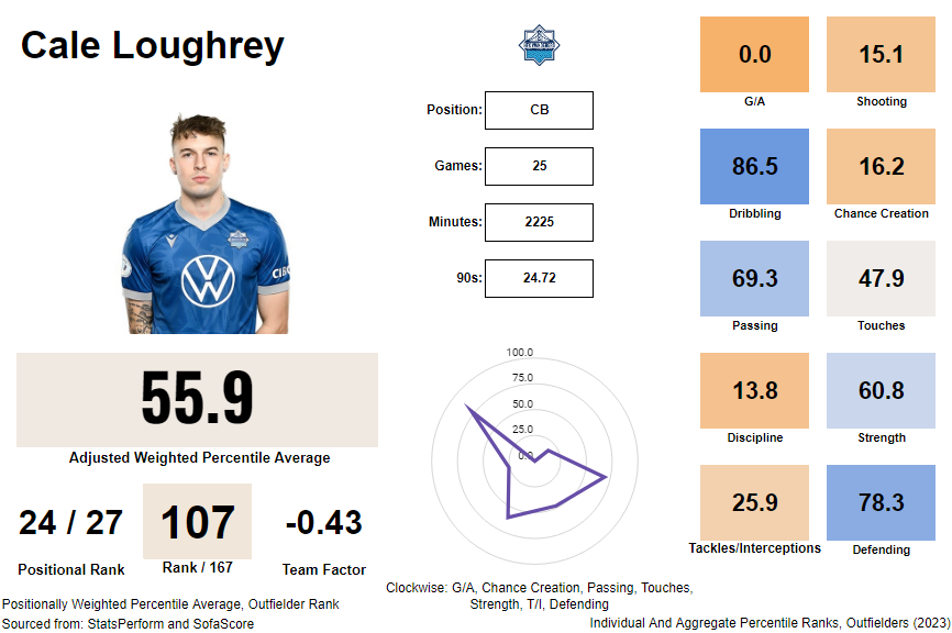 Overall, I'd describe Loughrey as a tall, strong, old-school defender but raw in some aspects of his game. Alex's model shows a player who is good defensively but who is one-dimensional. I'd argue his 55.9 WPA is low given his effectiveness as Nimick's partner but don't contest he can improve in several categories. Similar to the conundrum in getting data for full-backs, I believe it's harder to quantify a player like Loughrey's importance given his role. Often, he stays back as a safety when Nimick steps up; he is the player tasked to track back should a set piece go awry; he covers so the rest of the squad can play free. There's no number that can be attributed to credit Loughrey's ability to read the game and what that allows his teammates the liberty to do on the pitch.